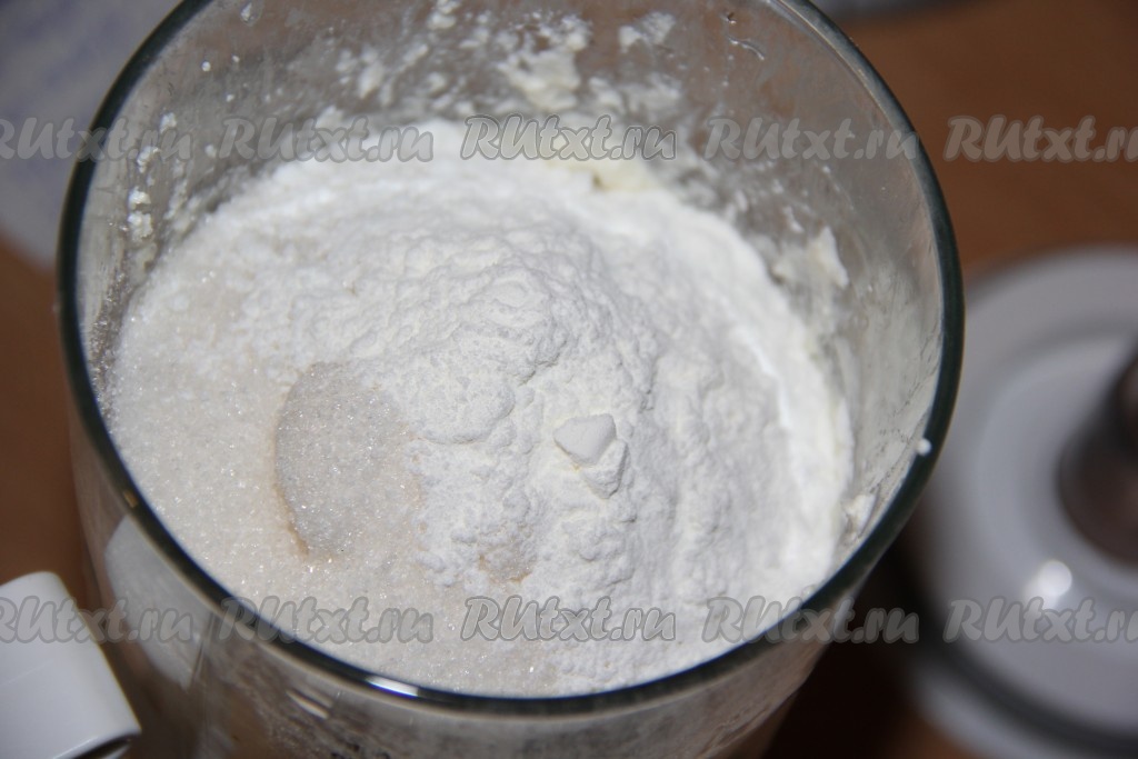 Затем в творожную массу всыпать крахмал и сахар, добавить сметану.