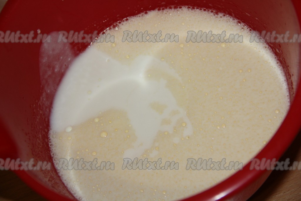 В получившуюся яичную смесь добавить сметану и соду, слегка взбить.
