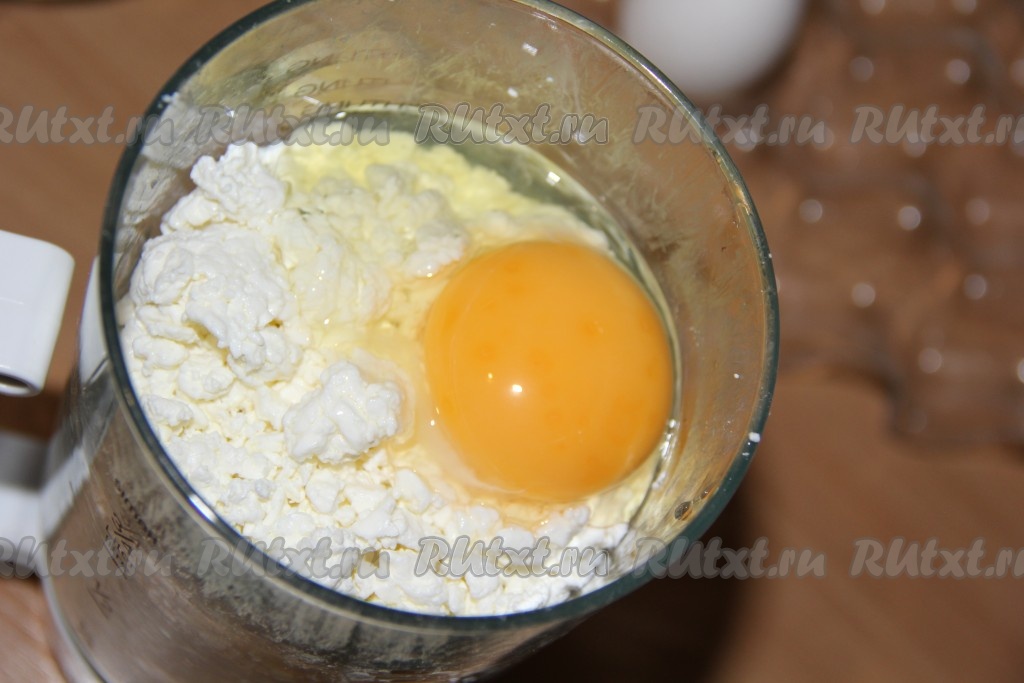 Для приготовления начинки в чашу блендера выложить творог, добавить яйца, пробить погружным блендером до однородности.