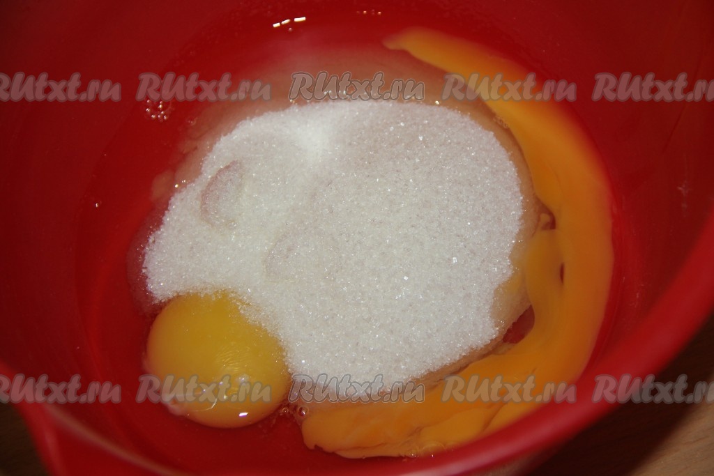 Отставить начинку в сторону и приготовить тесто для бисквита, для этого в миске соединить сахар и яйца.