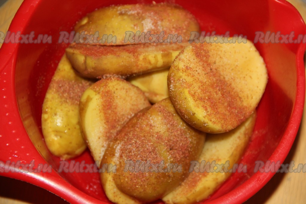 Разрезать картофель на две части вдоль, добавить соль, специи для картофеля и растительное масло. Тщательно перемешать картошку со специями и маслом.