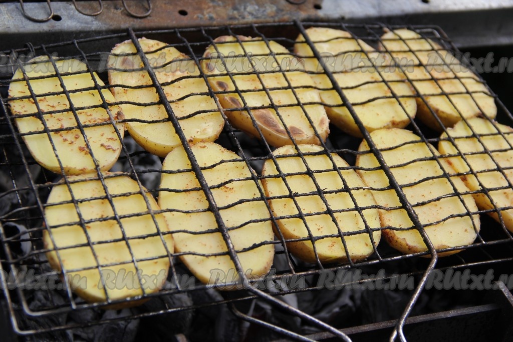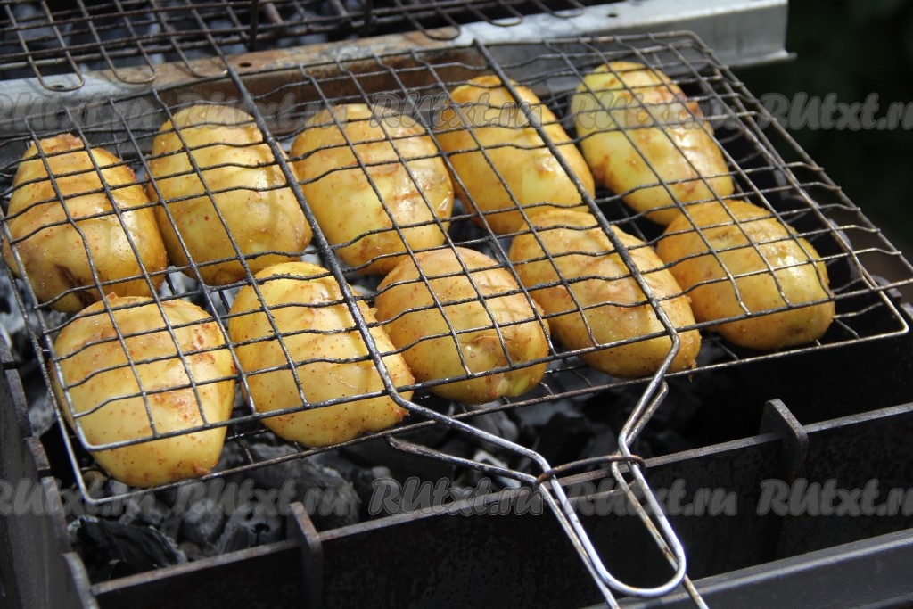 Выложить половинки картошин на решётку и зажать решётку с двух сторон. Мангал предварительно подготовить и разжечь угли. Выложить решётку с картошкой на раскалённые угли без огня. Жар у мангала должен быть хорошим, но без прямого огня.