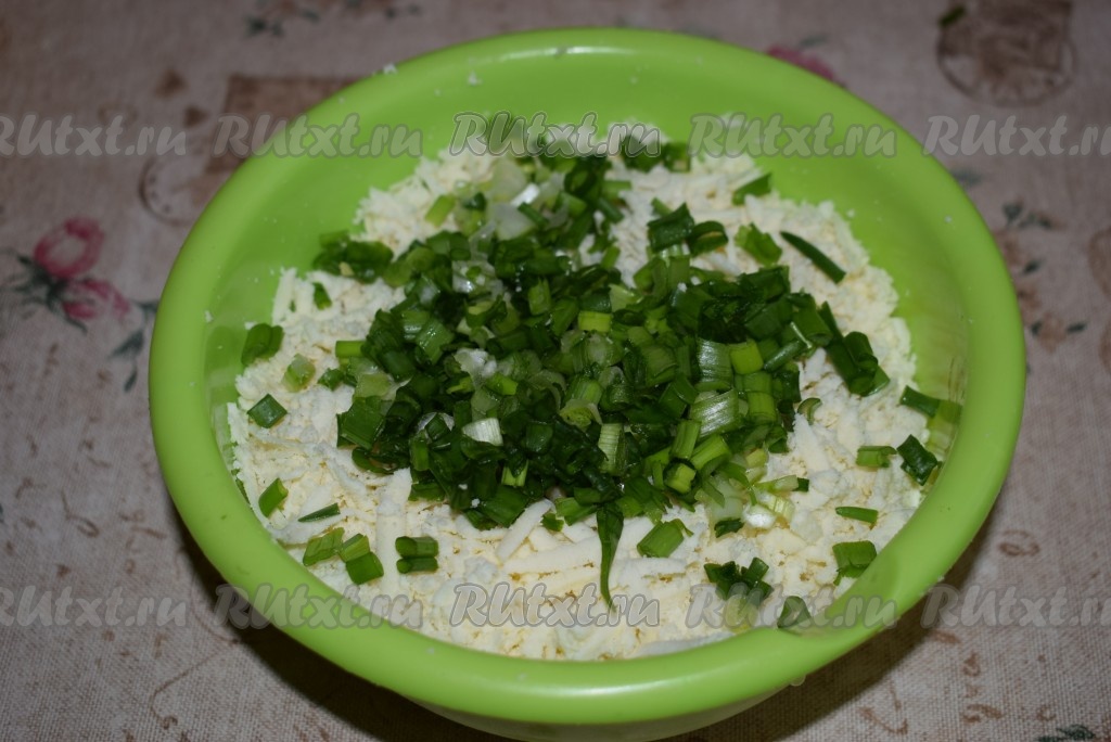 Зелёный лук нарезаем мелко и добавляем к натёртому сыру.