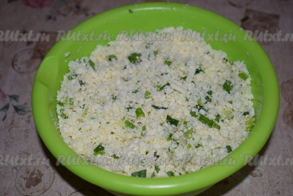 Перемешиваем адыгейский сыр и лук между собой, пробуем начинку, если необходимо, подсаливаем по вкусу, можно добавить специи или перец - это по желанию. Наша начинка для чебуреков готова.
