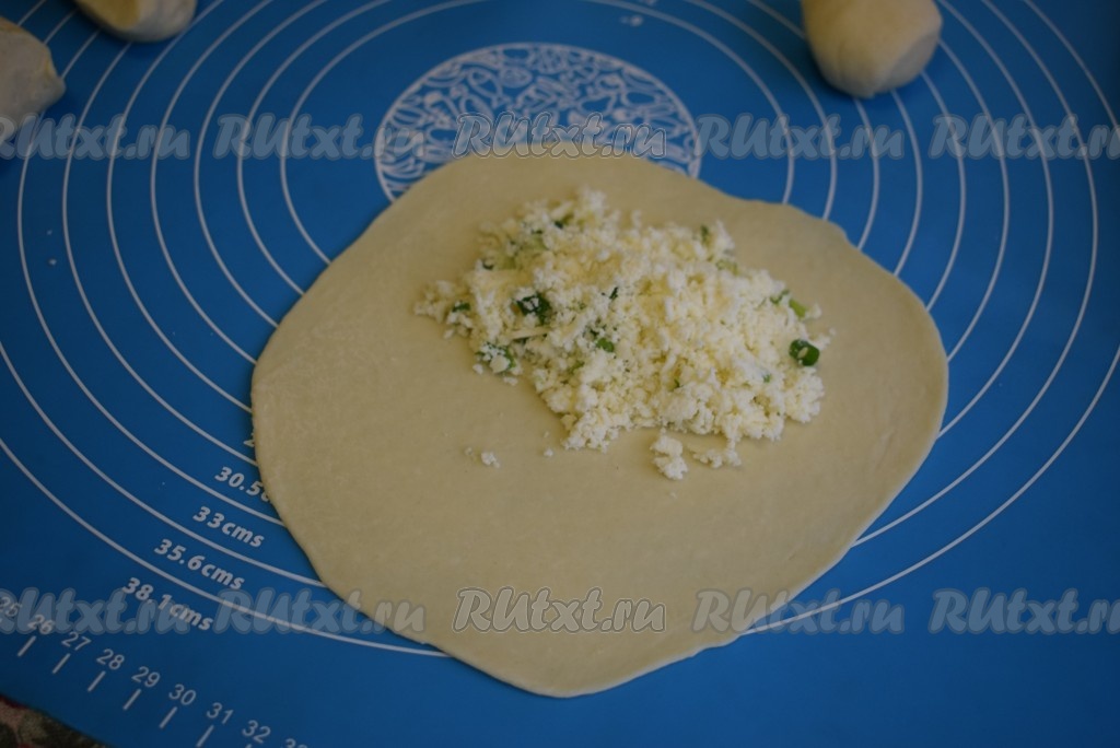 Далее на поверхности, припылённой мукой, каждый кусочек раскатываем в лепёшку толщиной около 1-2 мм. На один край каждой лепёшки выкладываем по 2 чайные ложки начинки.