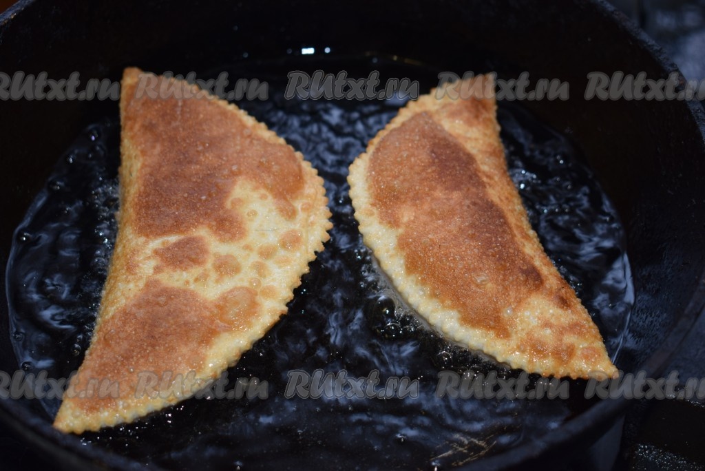Затем переворачиваем чебуреки на другую сторону и жарим ещё 3-4 минуты (до готовности).