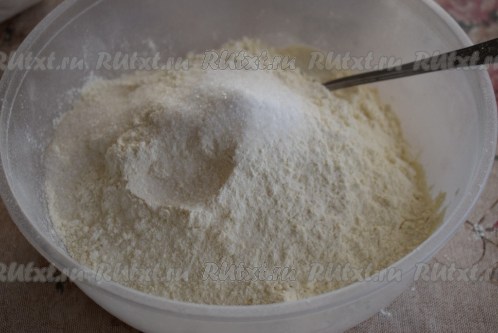 Сначала замесим тесто, для этого в миску насыпаем муку, добавляем сахар и соль.