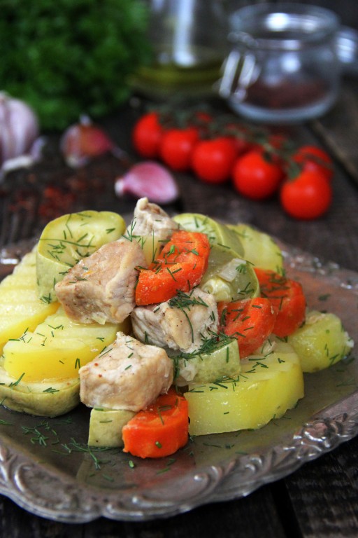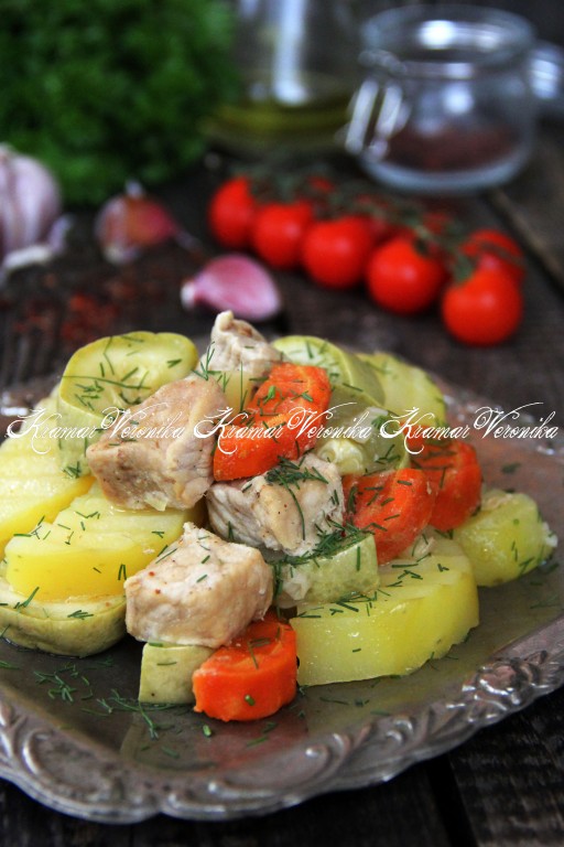 Мультиварка - отличная помощница на любой кухне. Предлагаю очень удачный рецепт приготовления свинины с картошкой и овощами в мультиварке. Блюдо получается сочным, аппетитным и сытным. Кусочки свинины и овощи в процессе приготовления обмениваются соками, а значит блюдо становится ещё более вкусным и ароматным. К мясу с картошкой я добавила морковку, перец болгарский, лук и кабачок, вы же можете использовать овощи, которые есть в наличии и которые нравятся вам и вашим близким. В дополнение к готовому блюду можно подать маринованные огурчики.