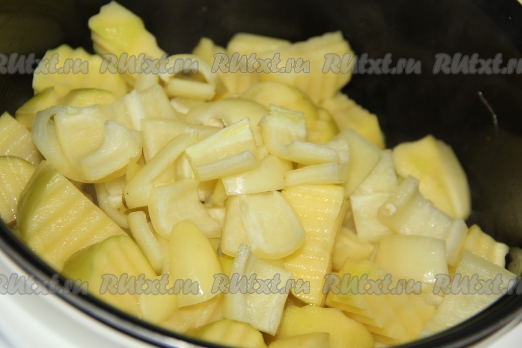 Картошку почистить, нарезать крупными ломтиками, выложить в чашу мультиварки.