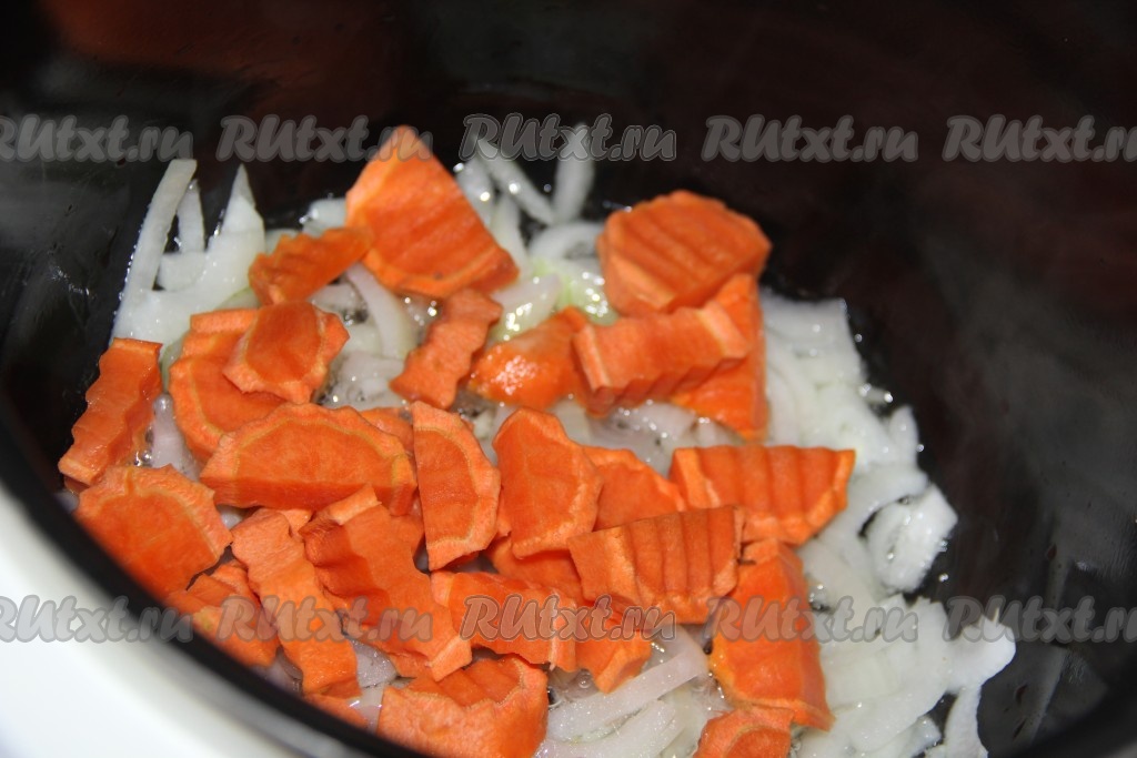 Морковь почистить, нарезать полукружочками (или кружочками), выложить в чашу и обжарить с луком, помешивая и не закрывая крышку, в течение 5 минут.