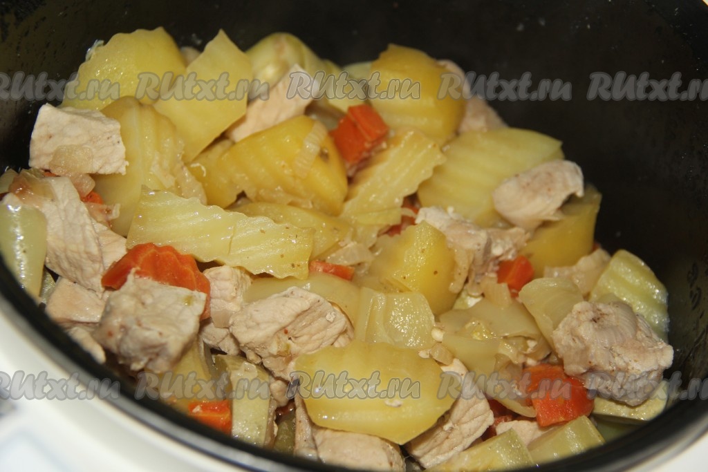 Перемешать кусочки свинины с картошкой и овощами, влить 100 мл воды, закрыть крышку мультиварки, выставить режим "Тушение" 1 час. По звуковому сигналу наше вкусное блюдо будет готово.