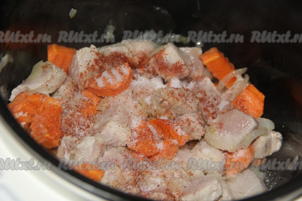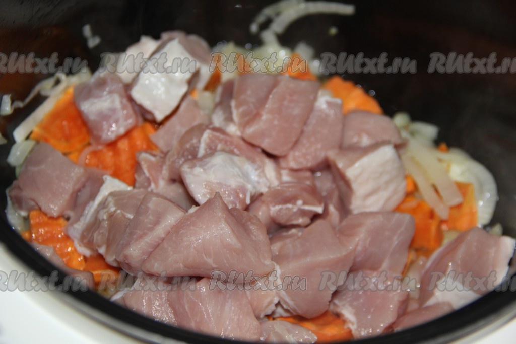 Затем добавить кусочки свинины.