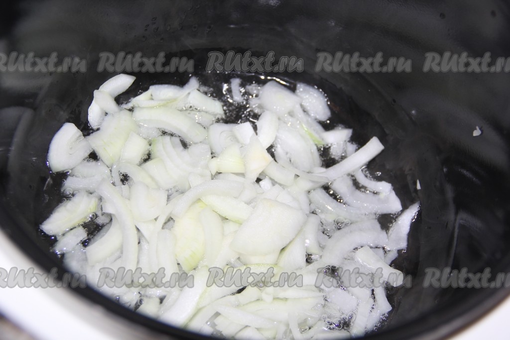 2 столовые ложки растительного масла влить в чашу мультиварки, добавить нарезанный лук, включить режим "Жарка". Обжарить лук, периодически помешивая, в течение 5 минут, не закрывая крышку мультиварки.