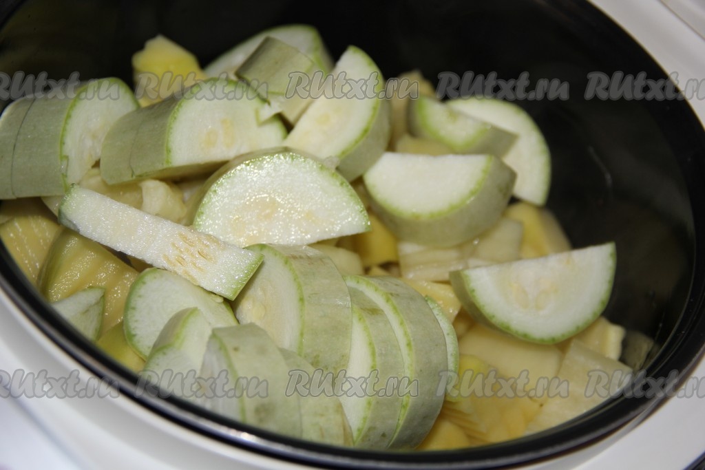 Кабачок (я брала молодой кабачок с тонкой шкуркой, поэтому готовила его, не очищая от шкурки) нарезать полукружочками и добавить в чашу.