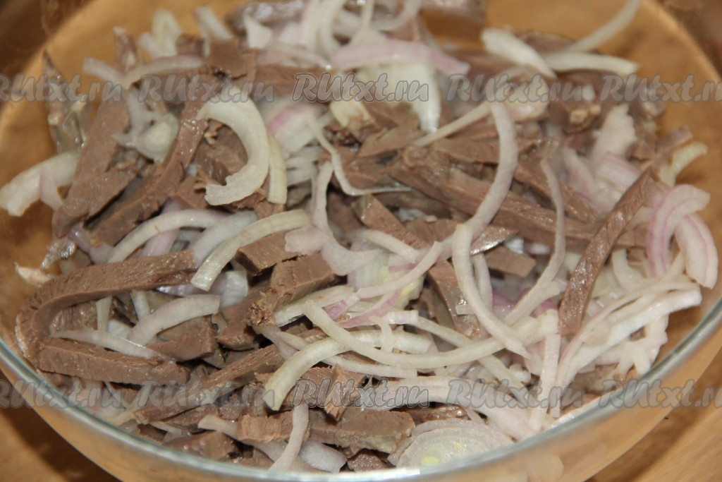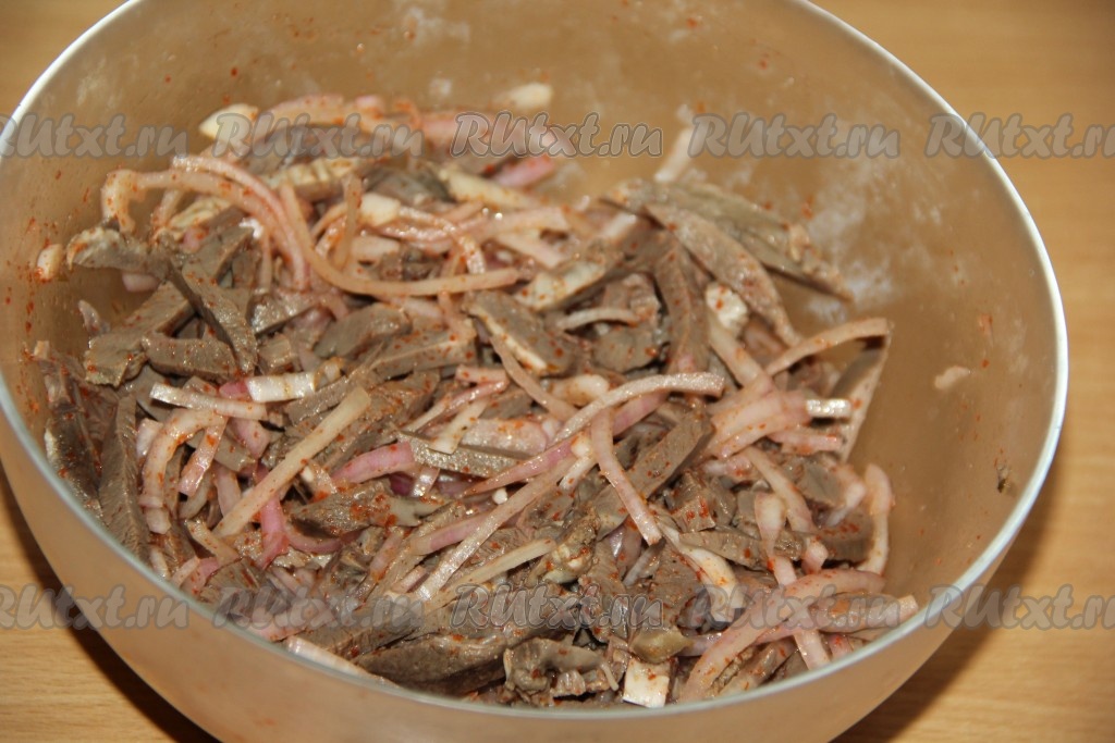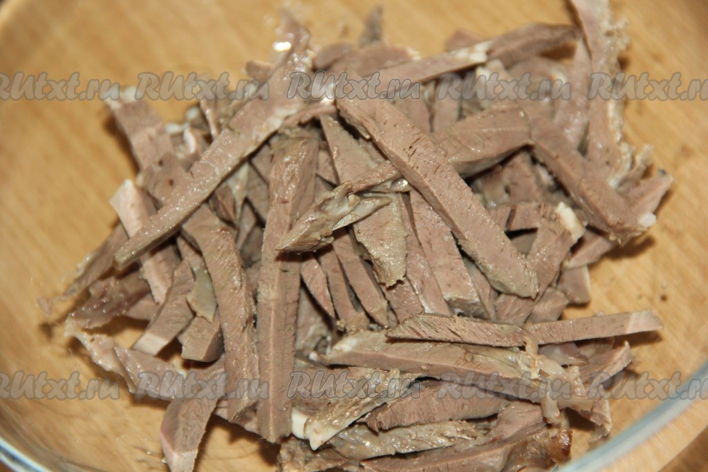 Сердце нарезать на длинные брусочки и поместить в глубокую миску.