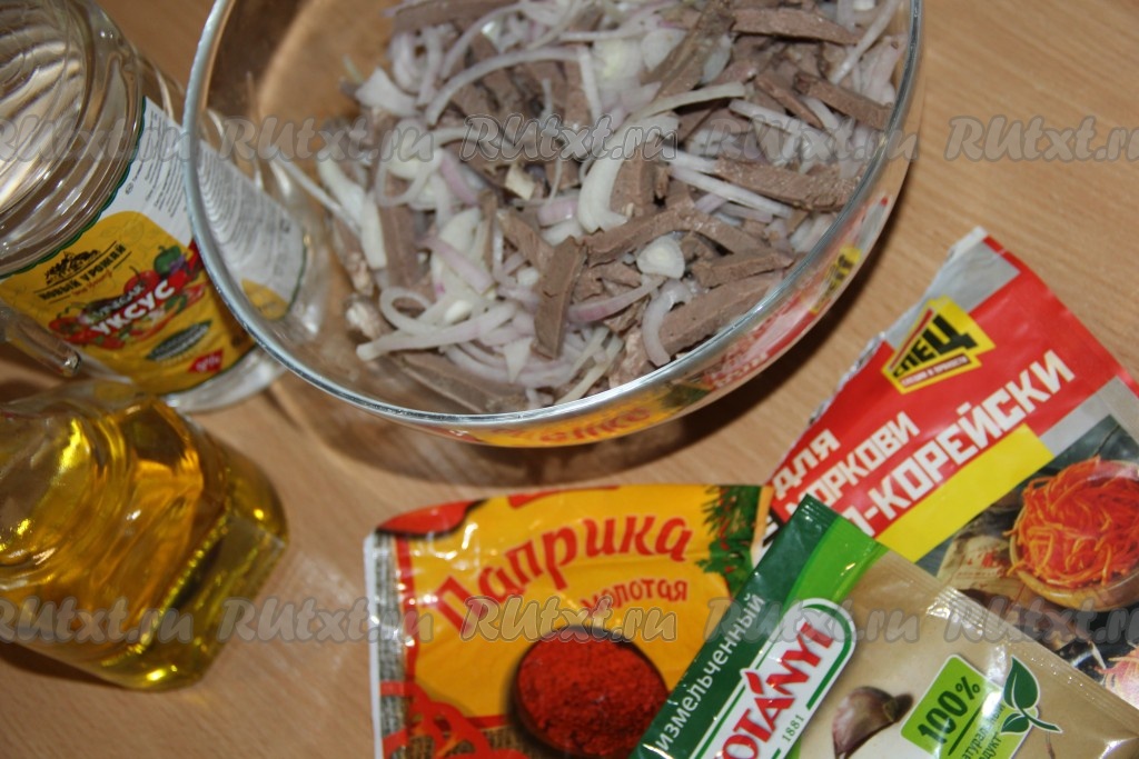 Добавить масло, уксус и соль, тщательно перемешать, накрыть крышкой и убрать хе из свиного сердца на сутки в холодильник. Я пару раз за сутки перемешала хе.