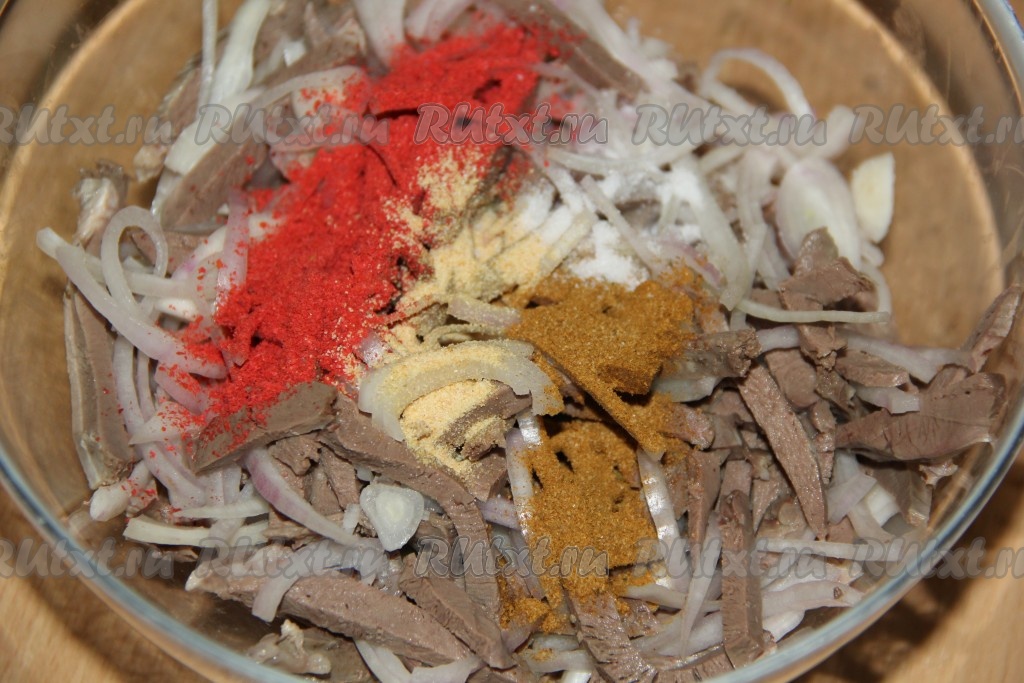 К свиному сердцу с луком добавить специи (паприку, приправу для корейской моркови), пропущенный через пресс чеснок (или сушёный чеснок).