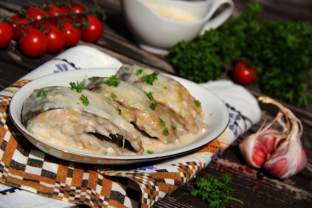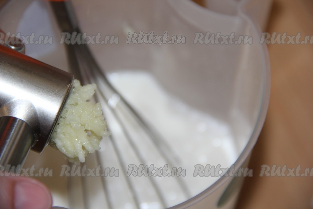 В получившийся сметанный соус добавить 2 очищенных зубчика чеснока, пропущенных через пресс, перемешать, слегка посолить.