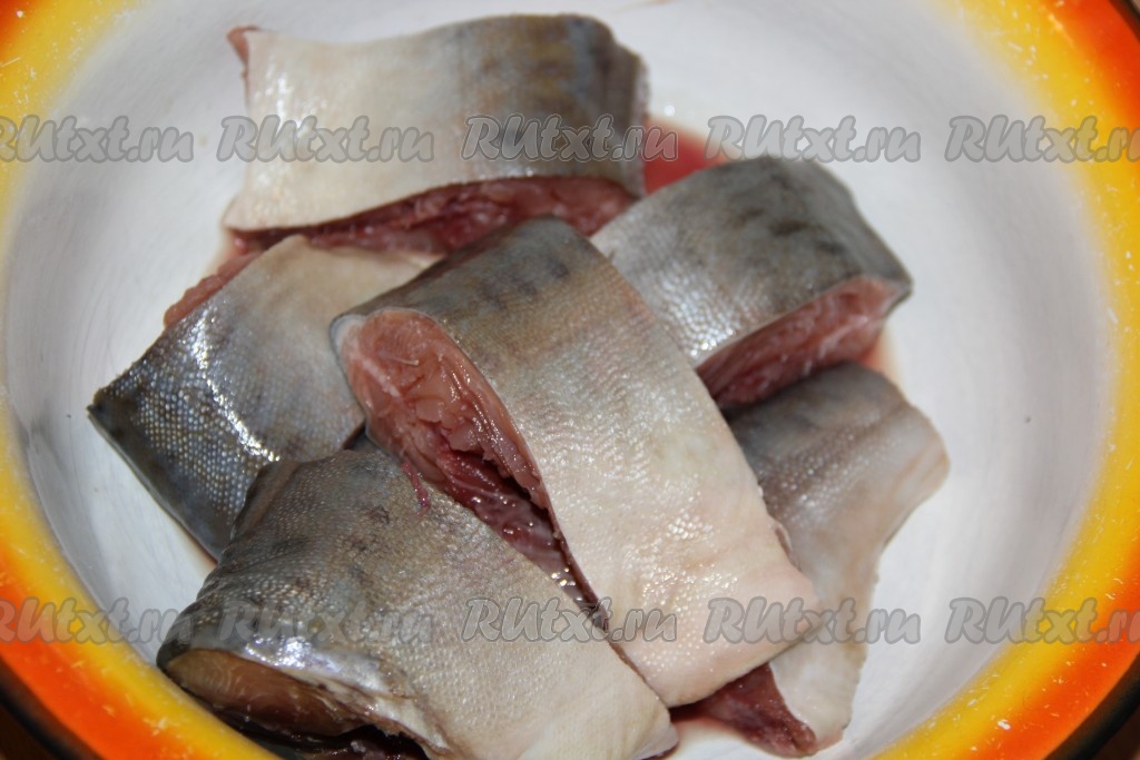 Нарезать горбушу на кусочки шириной, примерно, 3-4 см.
