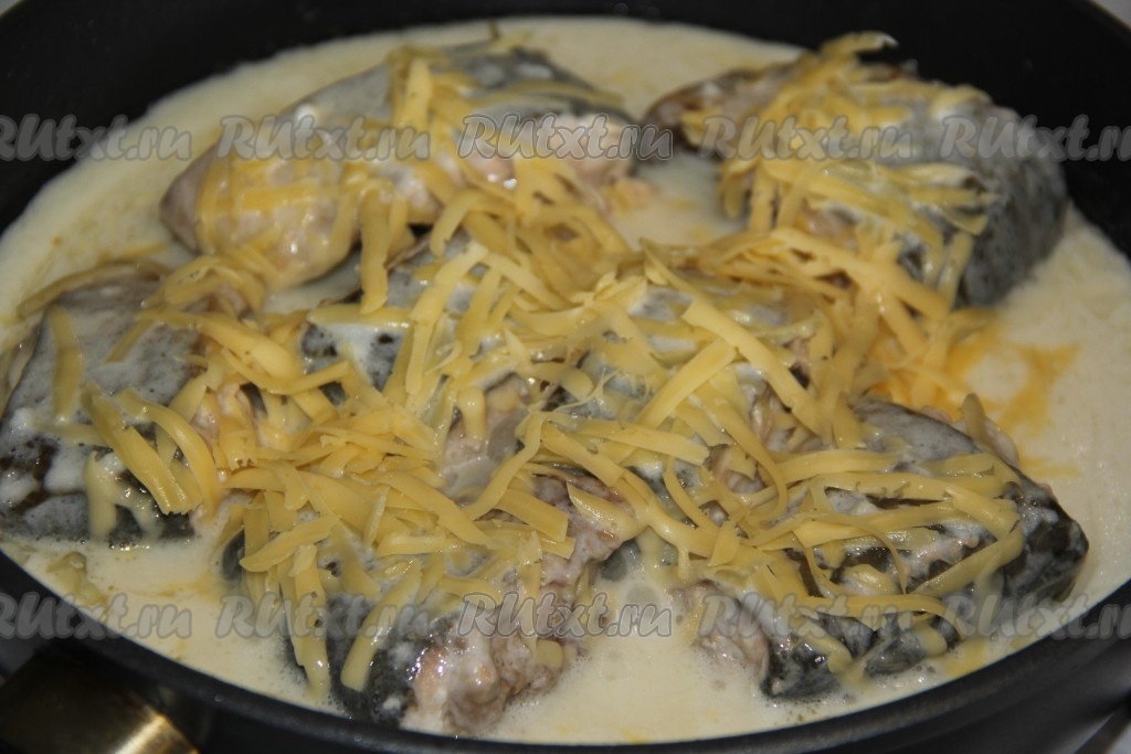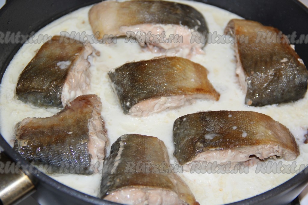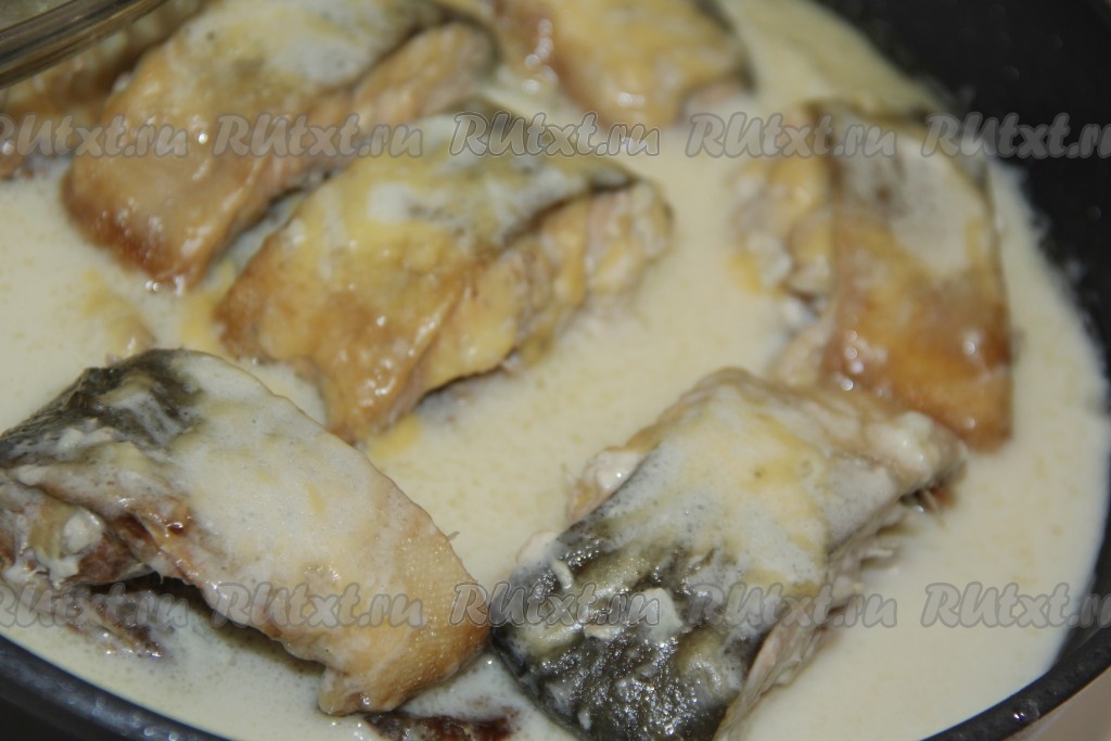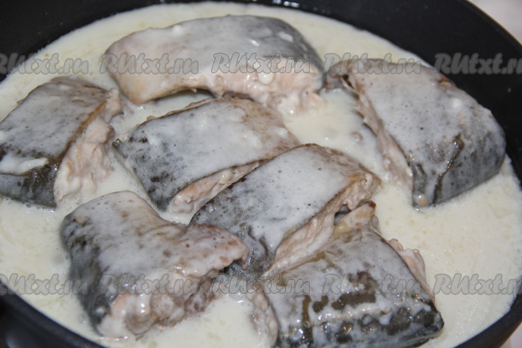 Полить горбушу сверху соусом с помощью ложки. Накрыть сковороду крышкой и тушить с момента закипания сметанного соуса 10 минут на небольшом огне.