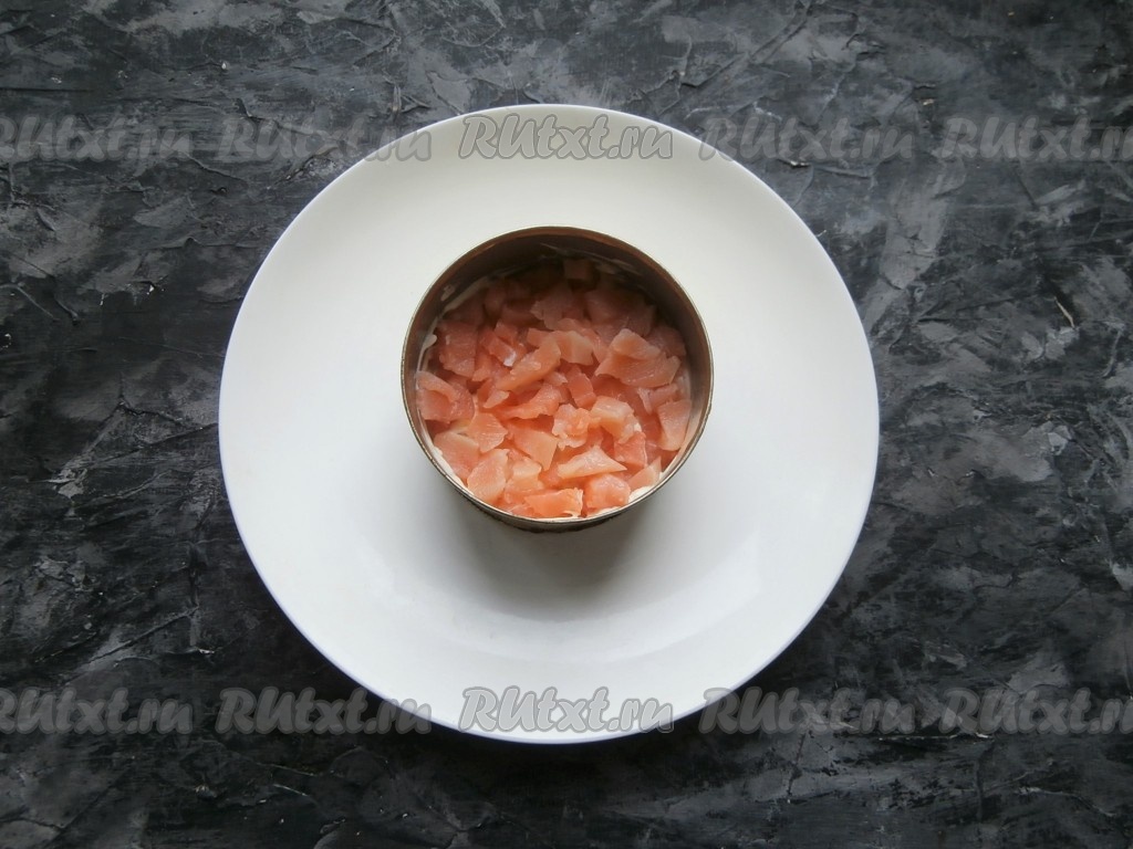 Следующим слоем выложить слабосолёное филе красной рыбы, нарезанное маленькими кусочками.