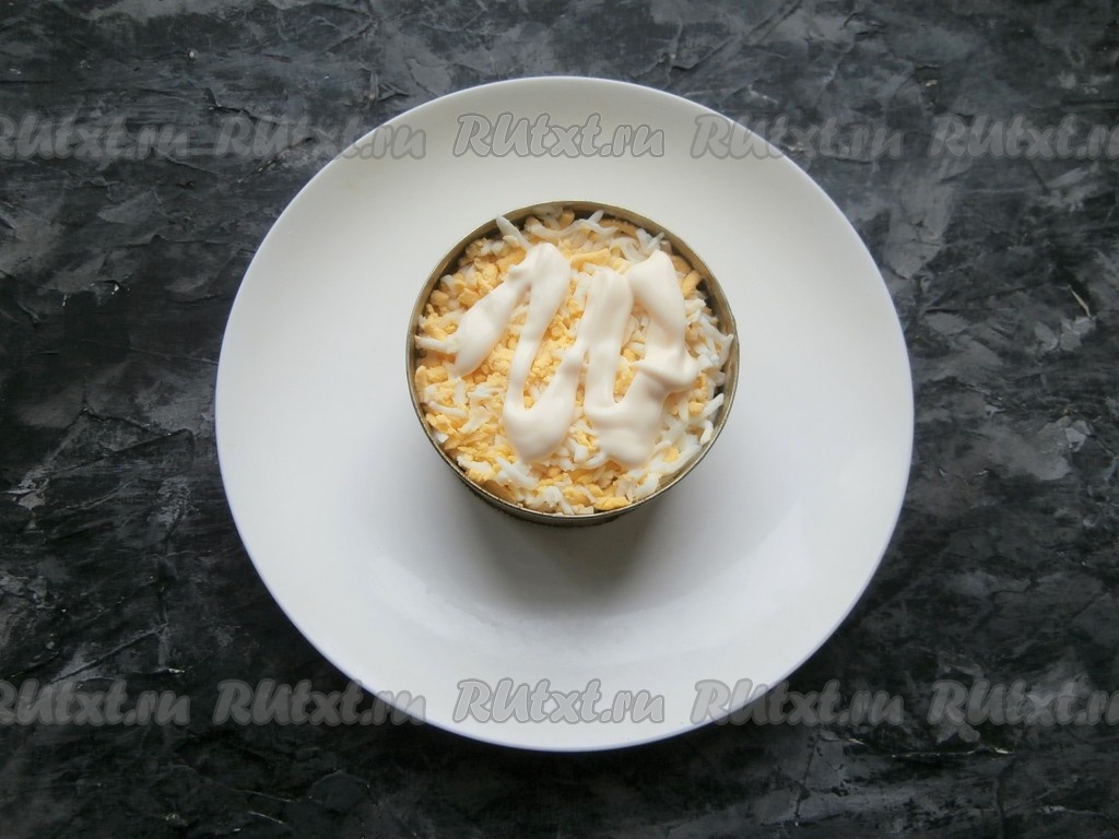 Яйцо натереть на мелкой (или средней) тёрке и разместить его следующим слоем, смазать майонезом.