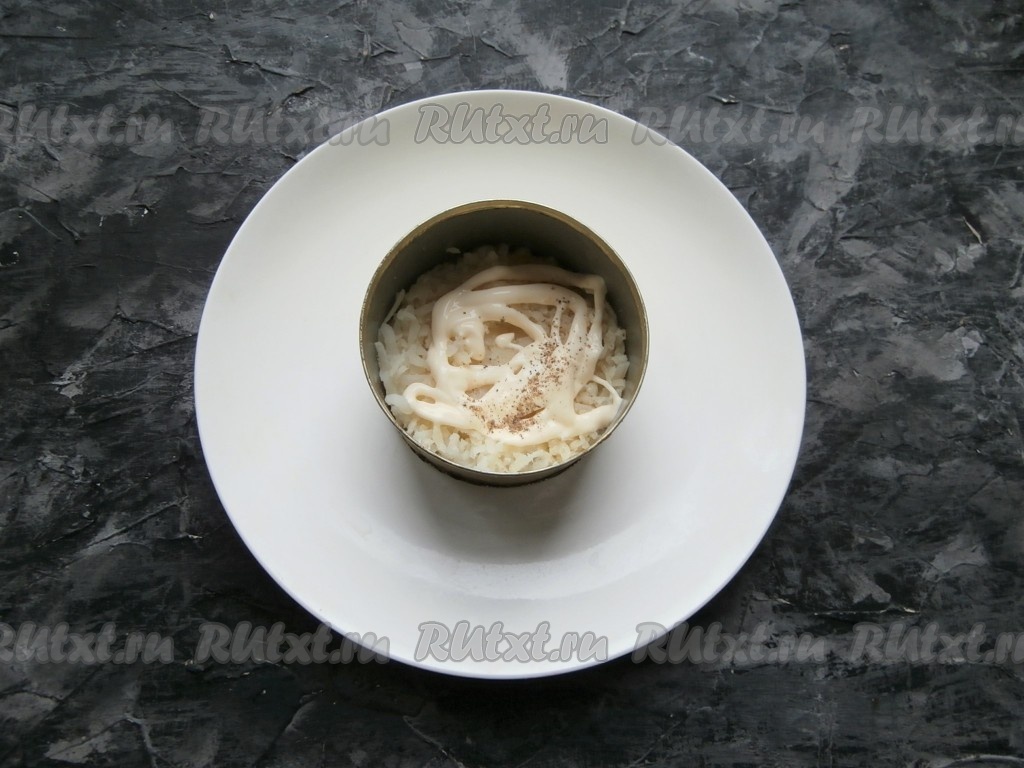 Отварить картофель в кожуре (картошка варится в кипящей воде около 20-25 минут) и яйцо (на варку яйца потребуется минут 8-10 минут), затем после остывания очистить. Салат я выкладывала порционно с помощью кольца. Первым слоем выложить натёртый на средней тёрке картофель, немного посолить, смазать его майонезом и чуть поперчить.