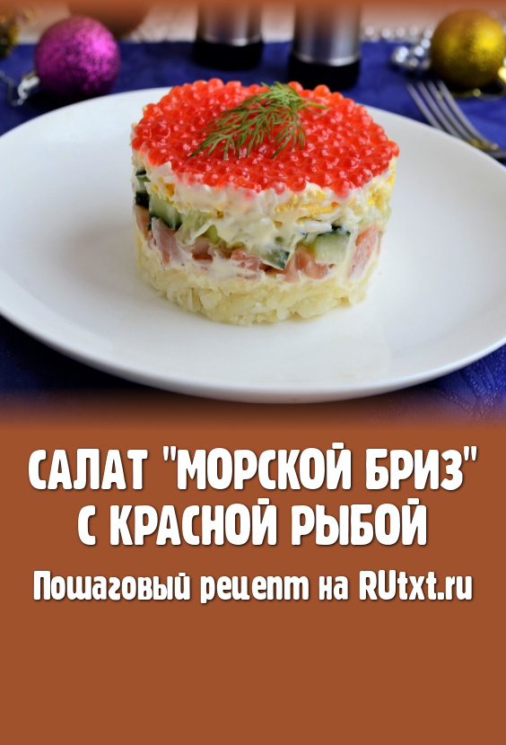 К праздничному столу, особенно к новогоднему или рождественскому, предлагаю приготовить вкусный, яркий слоёный салат "Морской бриз" с красной рыбой, украшенный красной икрой. Рецепт этого салатика я когда-то нашла в одном журнале и иногда готовлю его. Перед подачей этому салату обязательно нужно дать настояться и пропитаться около 1 часа. Расчёт продуктов - для 1 порции.