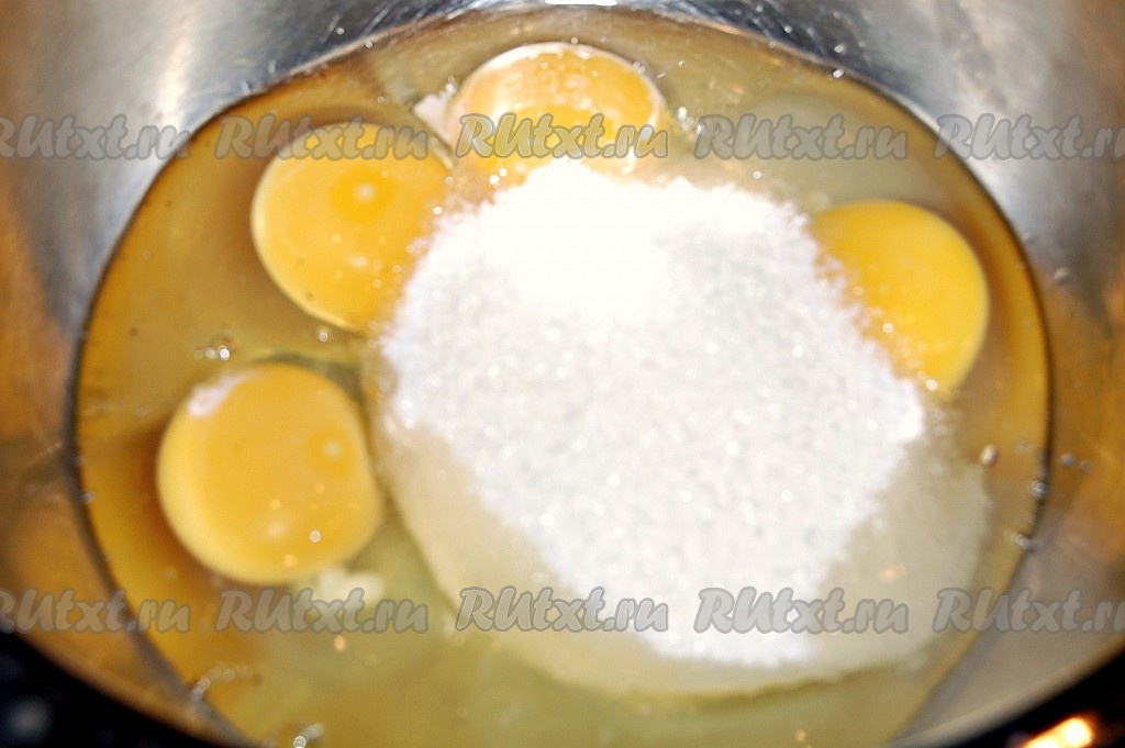 В миске разболтать яйца с сахаром.