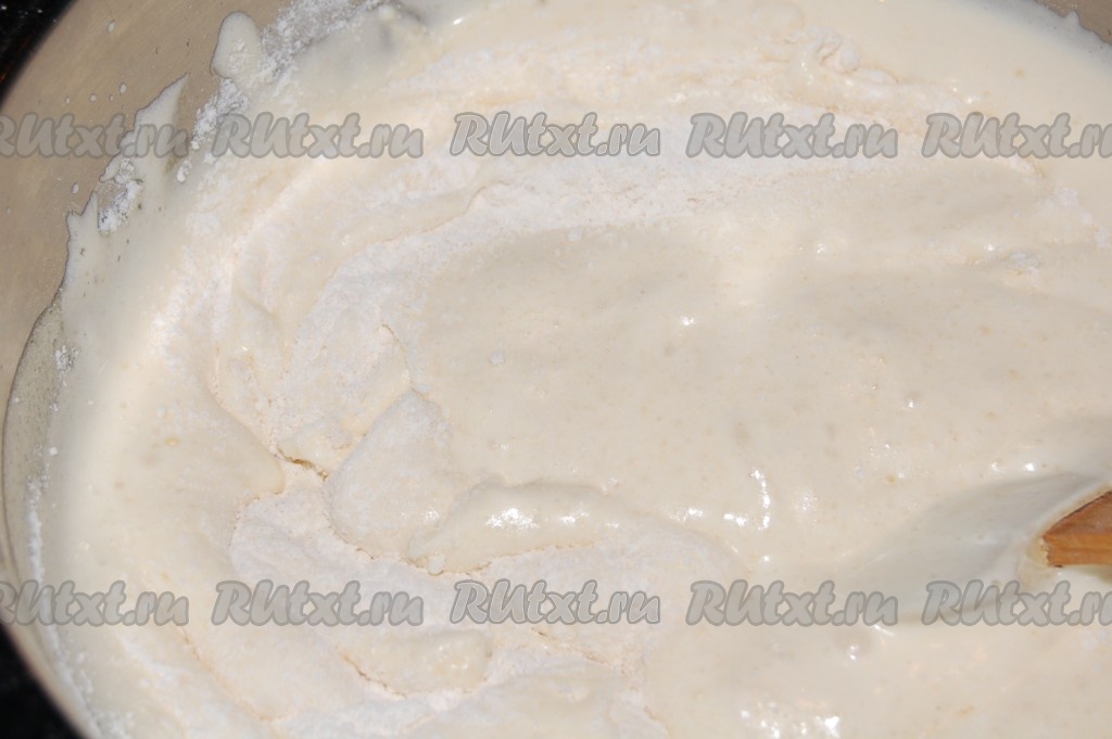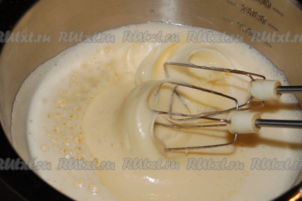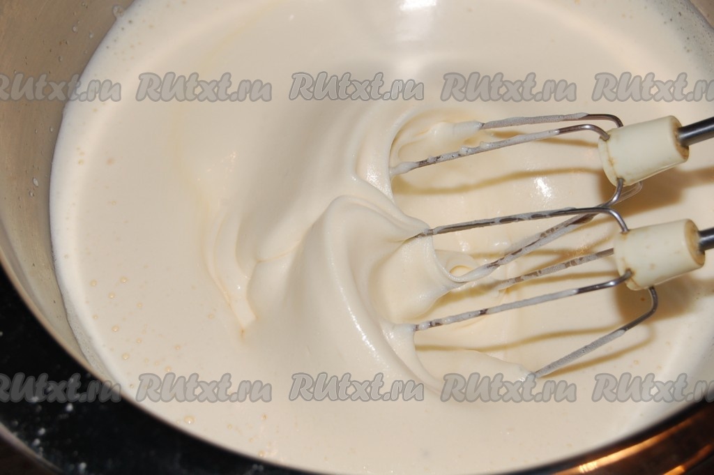 Миску снять с водяной бани и продолжать взбивать до полного остывания яичной массы и получения крепкой пены.