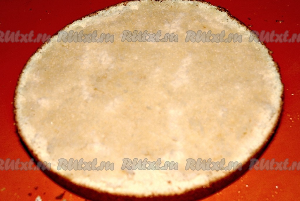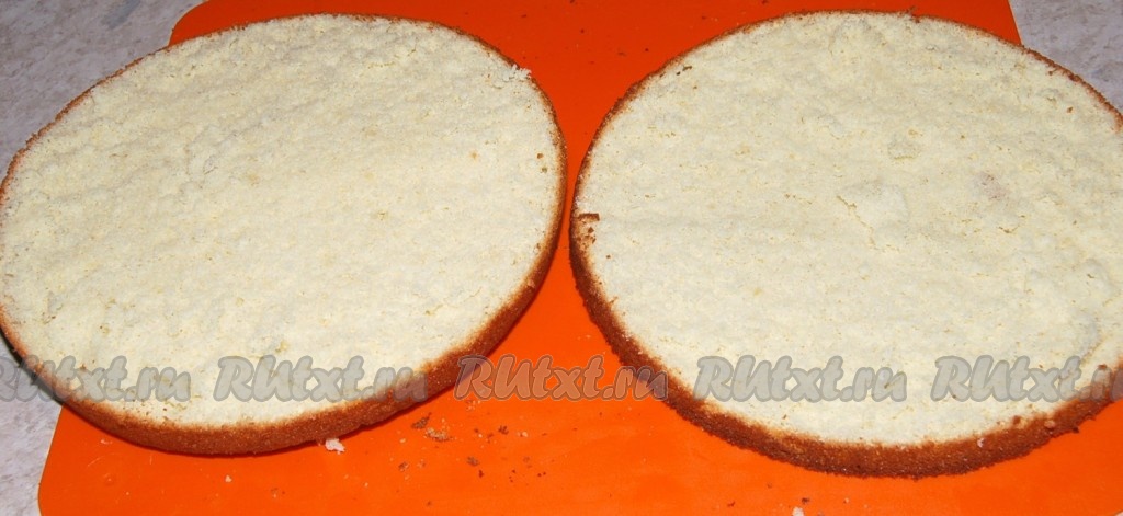 Остывший бисквит разрезать на два коржа.