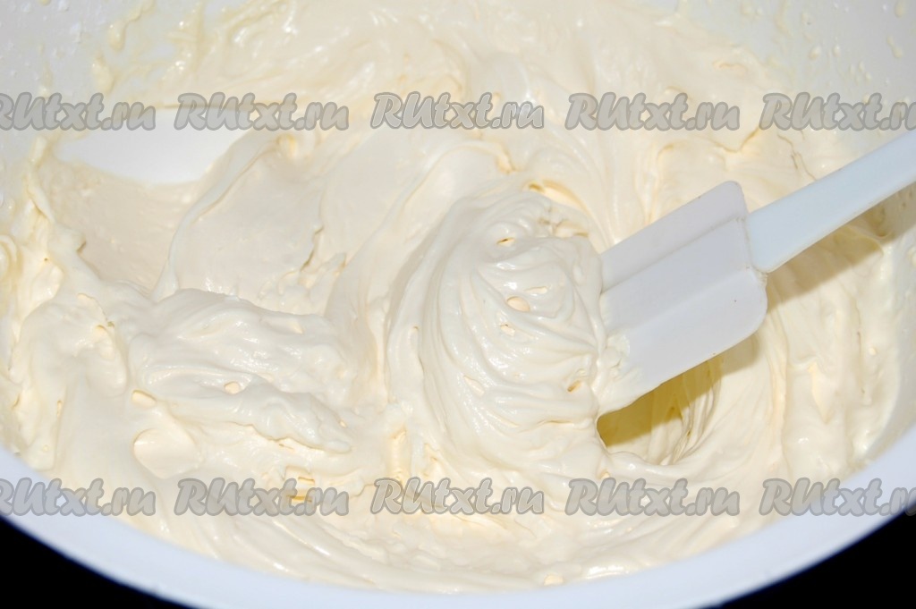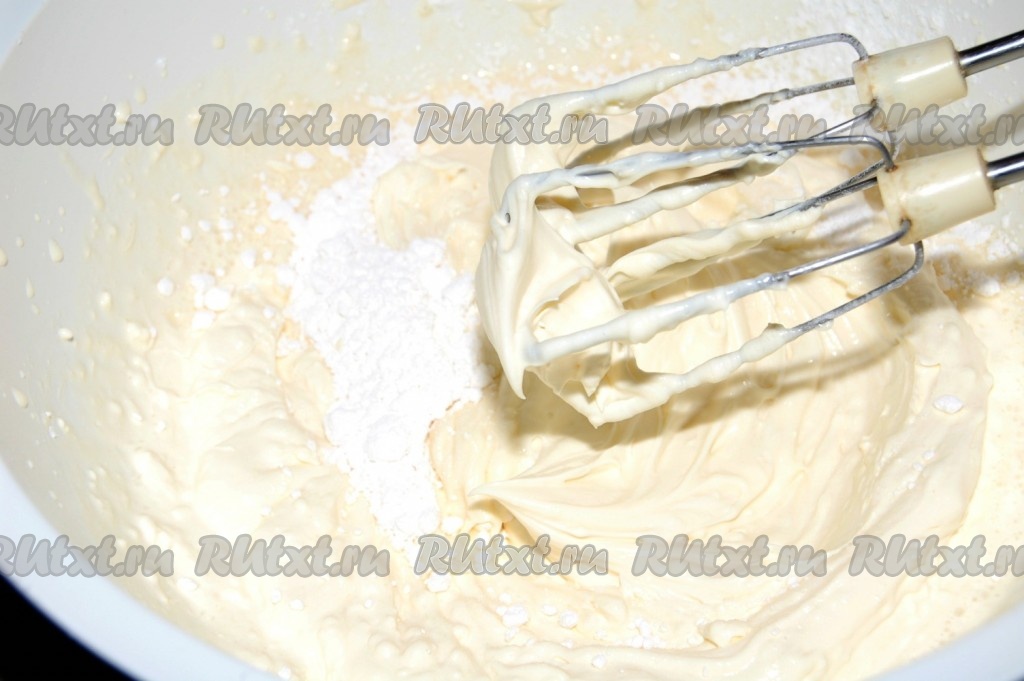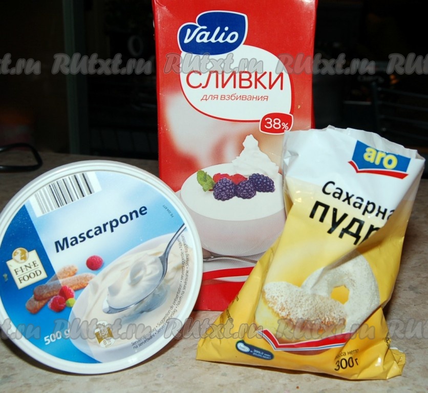Для крема взять маскарпоне, сливки и сахарную пудру. Соединить их вместе и взбить до пышной массы.