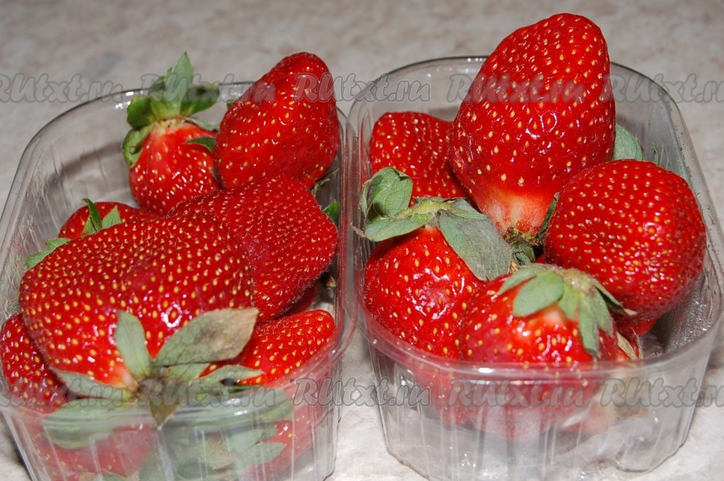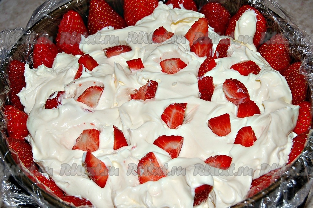 Часть клубники разрезать пополам и выложить по окружности формы срезом к бортику.