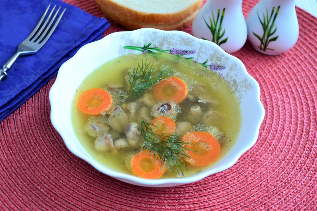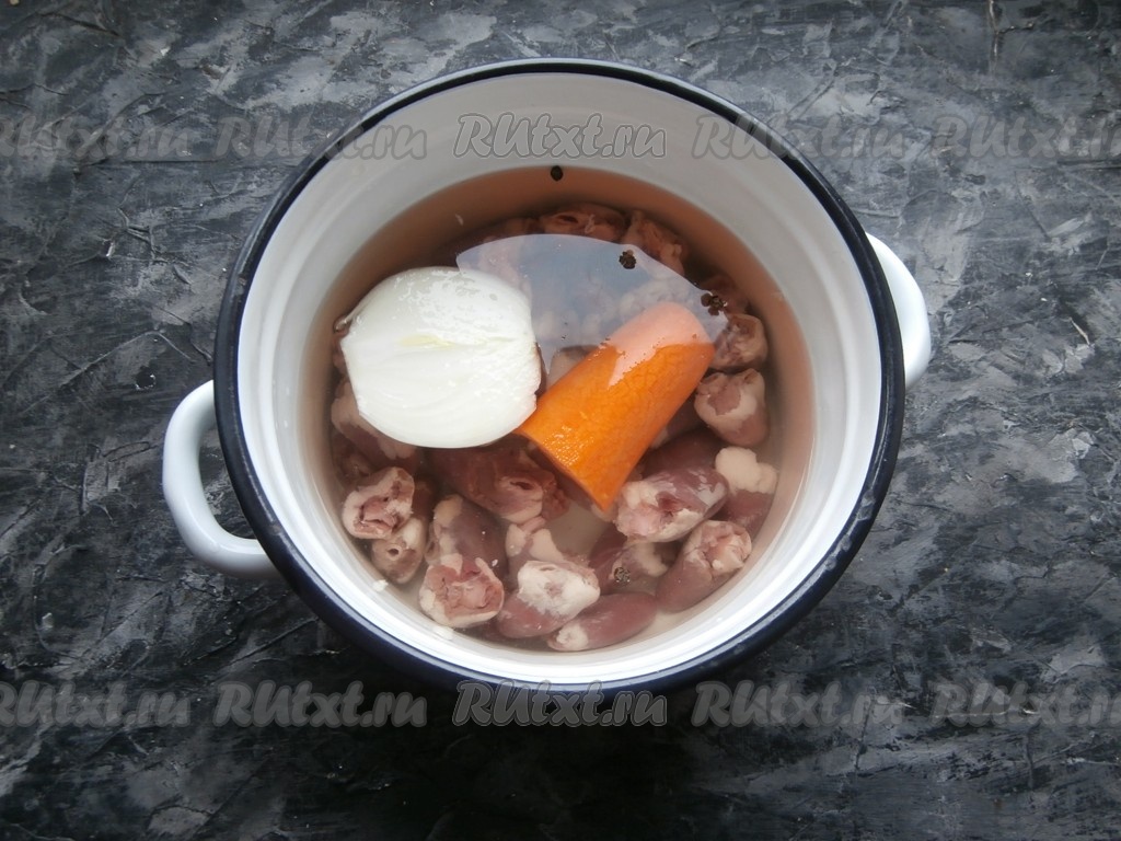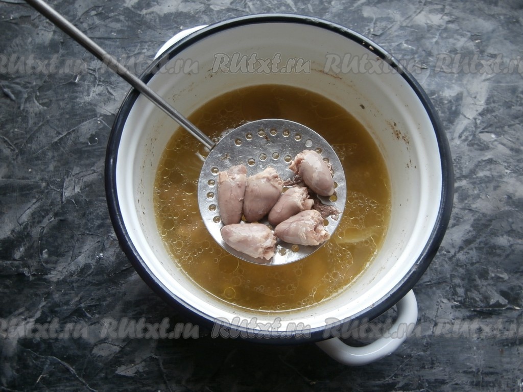 Когда сердечки проварятся минут 40-45 с начала кипения воды, снять кастрюлю с огня. Сердечки вынуть из бульона.