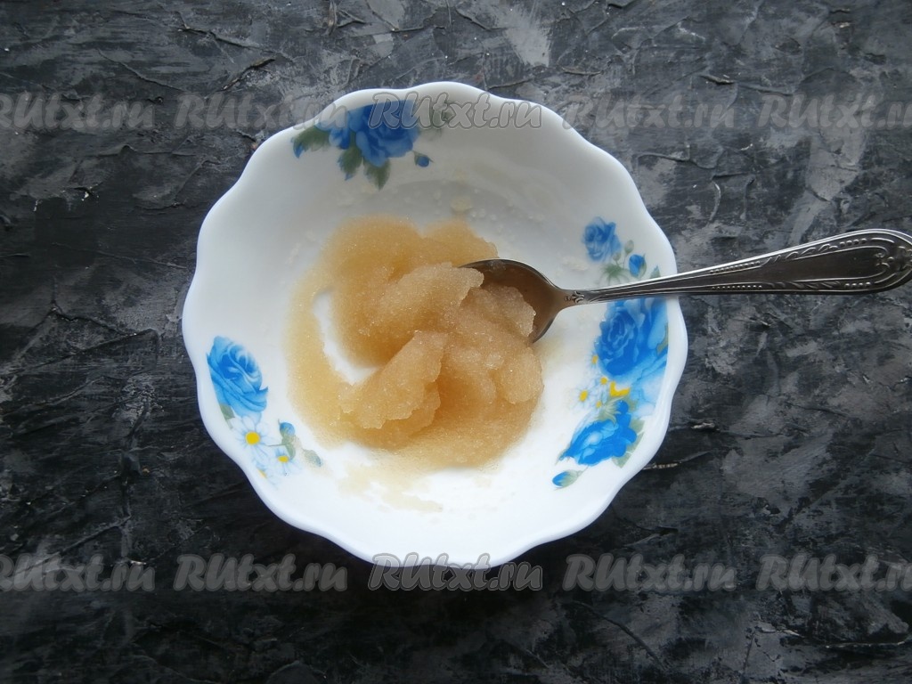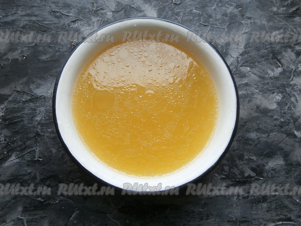 Когда бульон остынет до тёплого состояния, смешать 4-5 столовых ложек тёплого бульона с желатином, оставить на 5-7 минут.