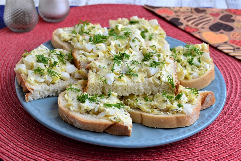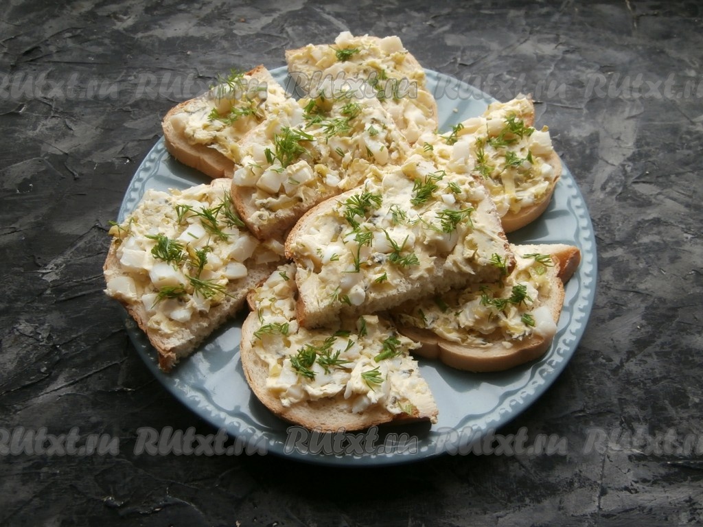 Ломтики батона смазать полученной массой, сверху посыпать измельчённым укропом (или петрушкой).