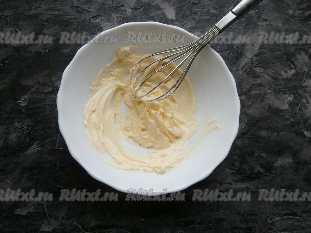 Сливочное масло оставить при комнатной температуре на 30-40 минут в глубокой тарелке (или миске), затем взбить его немного венчиком (до пышности).