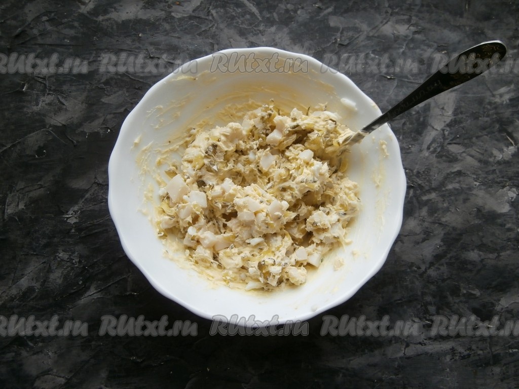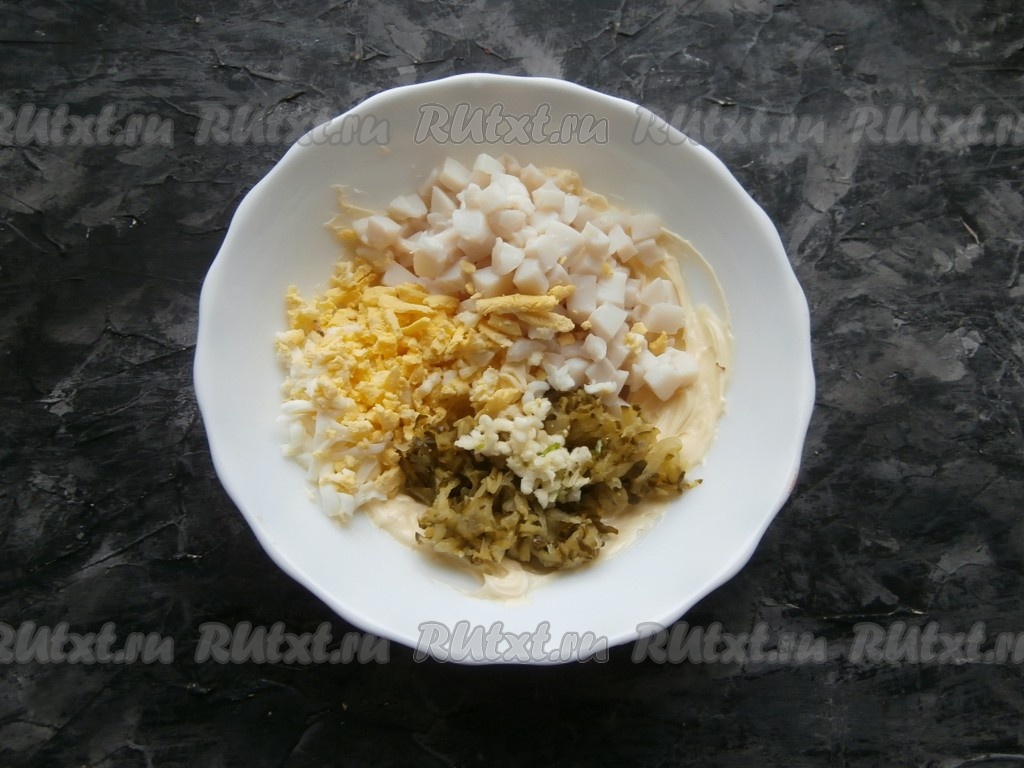 Предварительно сваренное вкрутую (в течение минут 10 с начала кипения воды) и очищенное яйцо, натереть на средней (или крупной) тёрке. Также натереть на тёрке и солёный огурец, хорошенько его отжать от жидкости.
