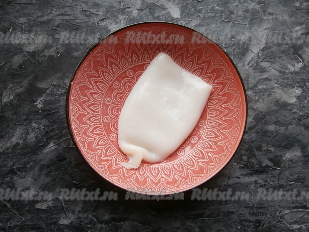 Хорошо промыть кальмара, выложить в небольшую кастрюльку, полностью залить кипящей водой. Накрыть крышкой и выдержать кальмара в таком виде 10 минут (ставить на огонь не нужно). По прошествии времени сразу промыть кальмара холодной водой, снять верхнюю плёнку, удалить, если есть, хорду, находящуюся внутри тушки.