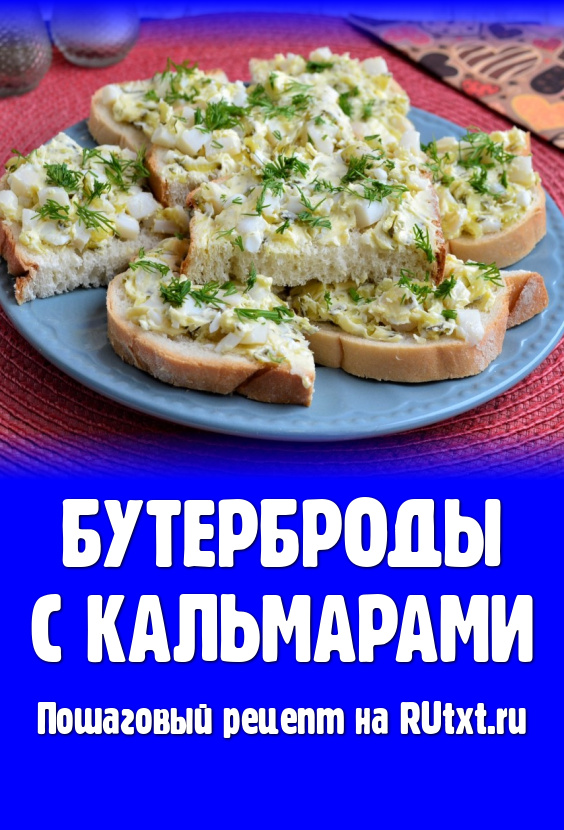 Одной из популярных закусок на любом праздничном столе являются бутерброды. Их готовят с разными начинками, добавками и обычно они съедаются быстрее всех блюд. Недавно попробовала бутерброды с кальмарами, - такие я ещё не готовила. Оказалось, что они очень вкусные, аппетитные и сытные. Попробуйте и вы, уверена, вам они тоже понравятся!