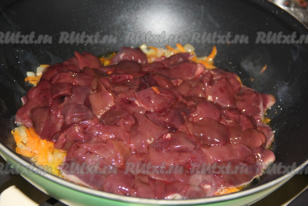 Потушить печень с овощами под крышкой на небольшом огне 10 минут, периодически перемешивая. Затем разрезать один кусочек куриной печени, если в разрезе выделяется прозрачный сок, без примесей крови, значит печёнка готова (если в разрезе печени будут примеси крови, потушите ещё 1-2 минуты).