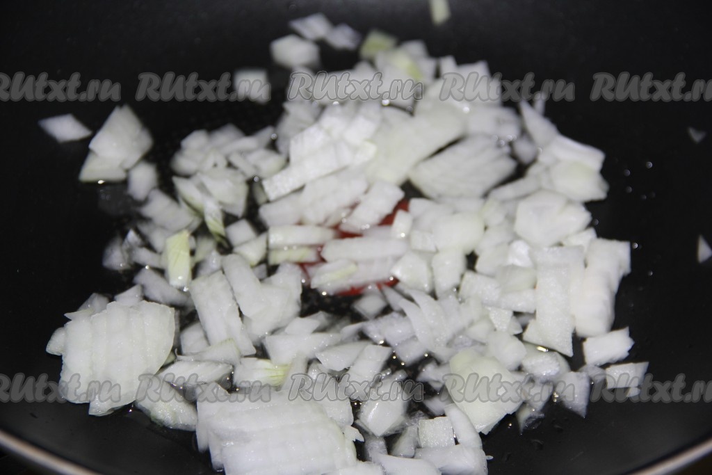 В сковороду с высокими бортиками влить масло, добавить очищенный и мелко нарезанный лук, обжарить на среднем огне, помешивая, минут 5 (лук должен стать прозрачным).