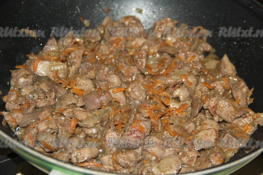 Прогреть макароны с куриной печенью на сковороде минуты 3, периодически перемешивая, и снять с огня.