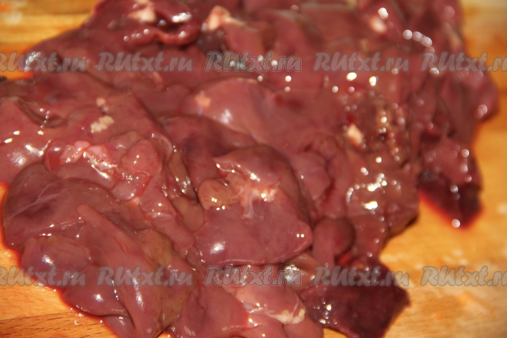 Промыть куриную печень под проточной водой, затем нарезать на средние кусочки.