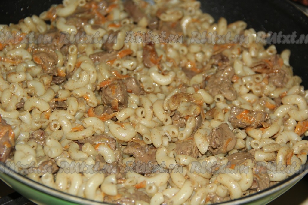 Добавить в сковороду отваренные макароны и перемешать с печенью.