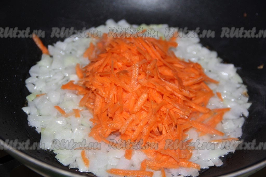 Морковь почистить, натереть на крупной тёрке и добавить в сковороду с обжаренным луком. Овощи обжаривать минут 7, не забывая иногда перемешивать.
