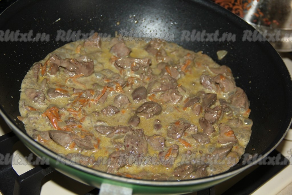 Перемешать куриную печень со сметаной и потомить на медленном огне 3 минуты.