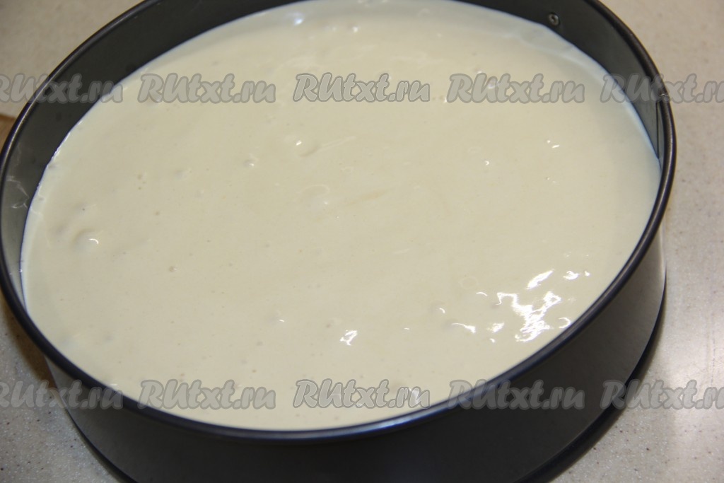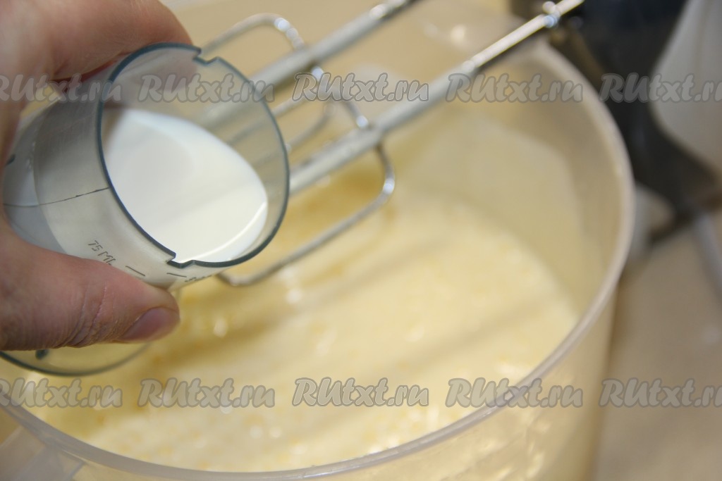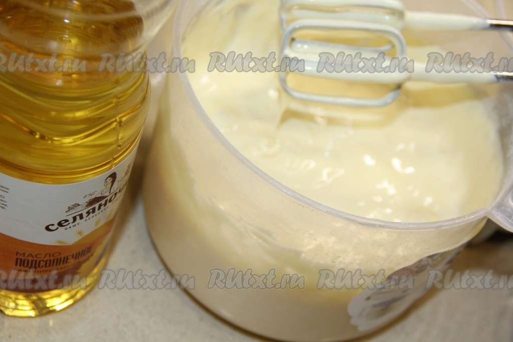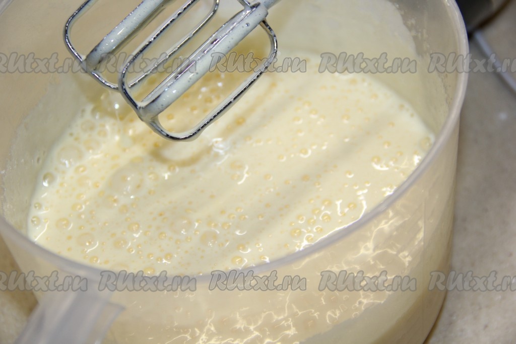 Влить растительное масло и ещё раз перемешать миксером до однородности. Тесто получится воздушным, напоминающим сметану средней густоты.