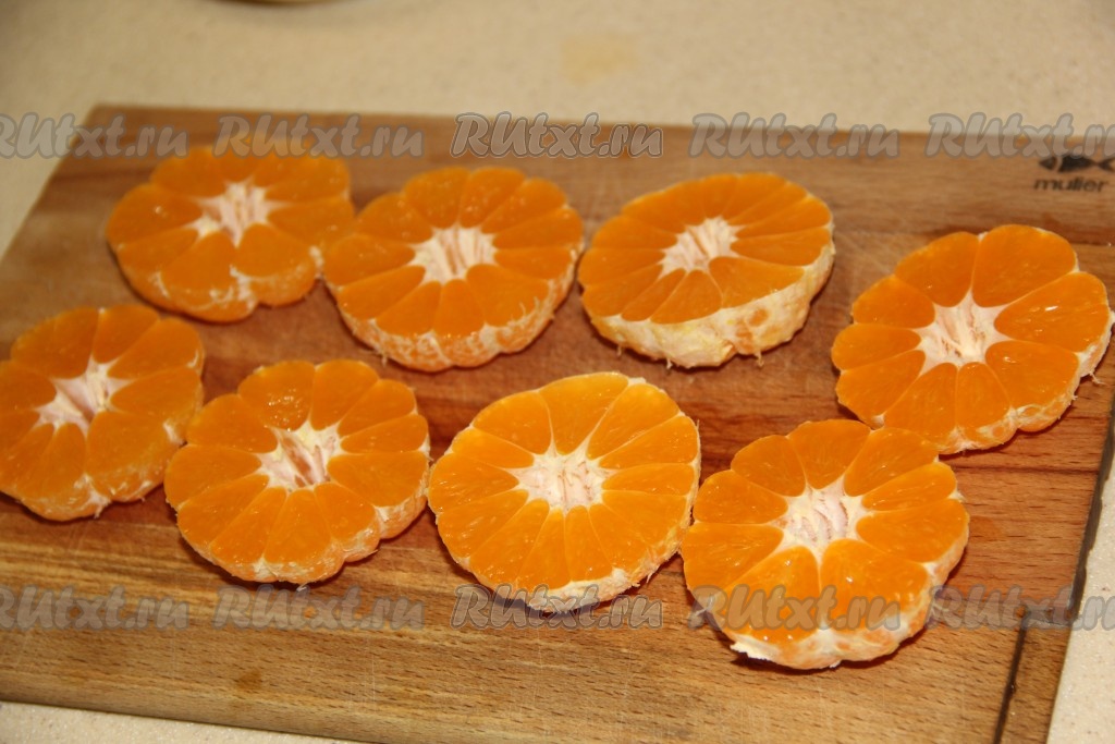 Мандарины почистить. Каждый мандарин разрезать поперёк на две половины. Для этого пирога желательно выбирать мандарины без косточек, если всё же косточки есть, то их нужно удалить.
