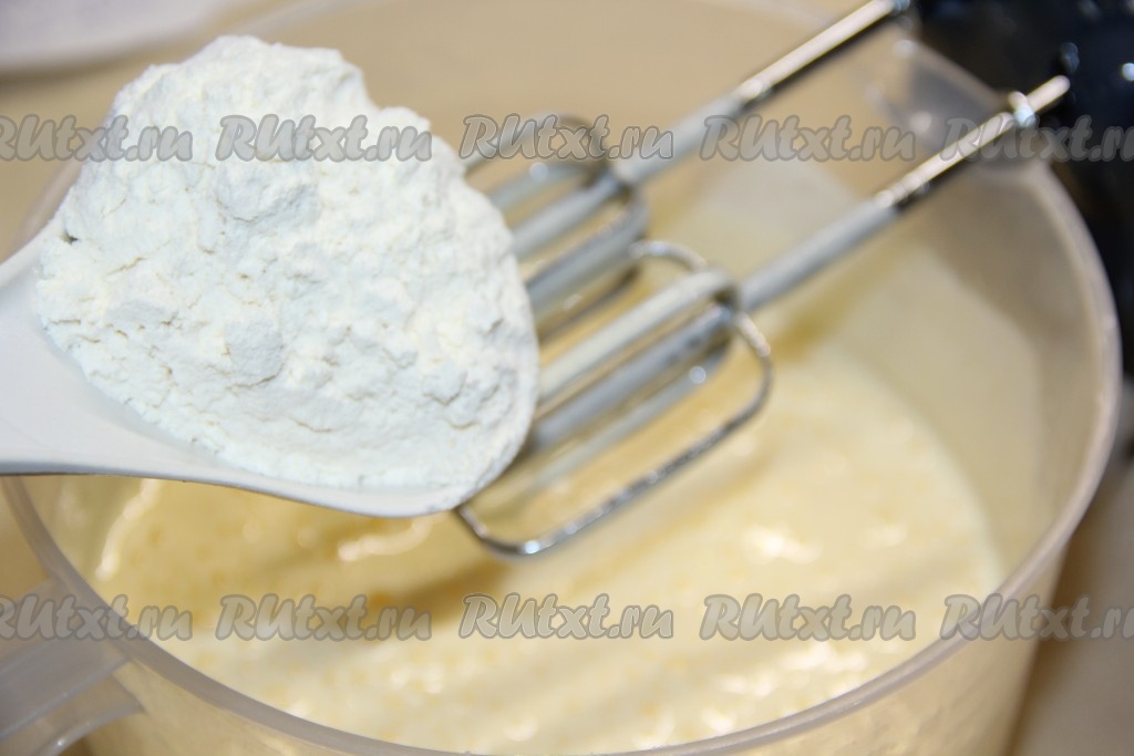 Добавить муку и разрыхлитель, перемешать на низкой скорости миксера до однородного состояния.